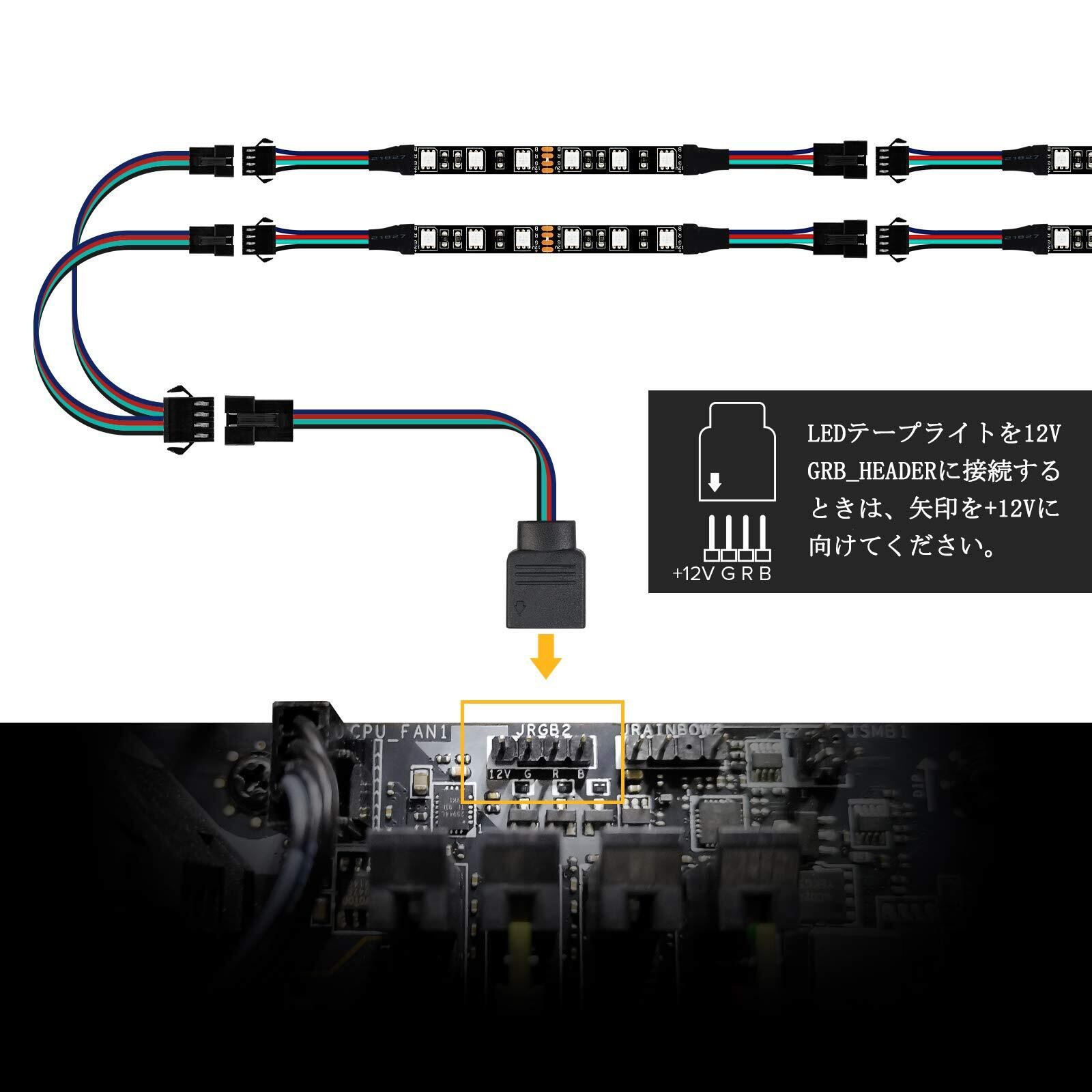 【パッケージに含まれるもの】1〜2 4PIN-SMインターフェース、1X 4PIN(+ 12VデータN / A GND)ADDプラグ、1X 4PIN(+ 12VデータGND)ADDプラグ、2X LEDテープライト(各50cm)。そして、3ピンの5V RGB_HEADER(5V、G、R、B)には絶対に接続しないでください。そうしないと、LEDテープライト全体が破壊されます。