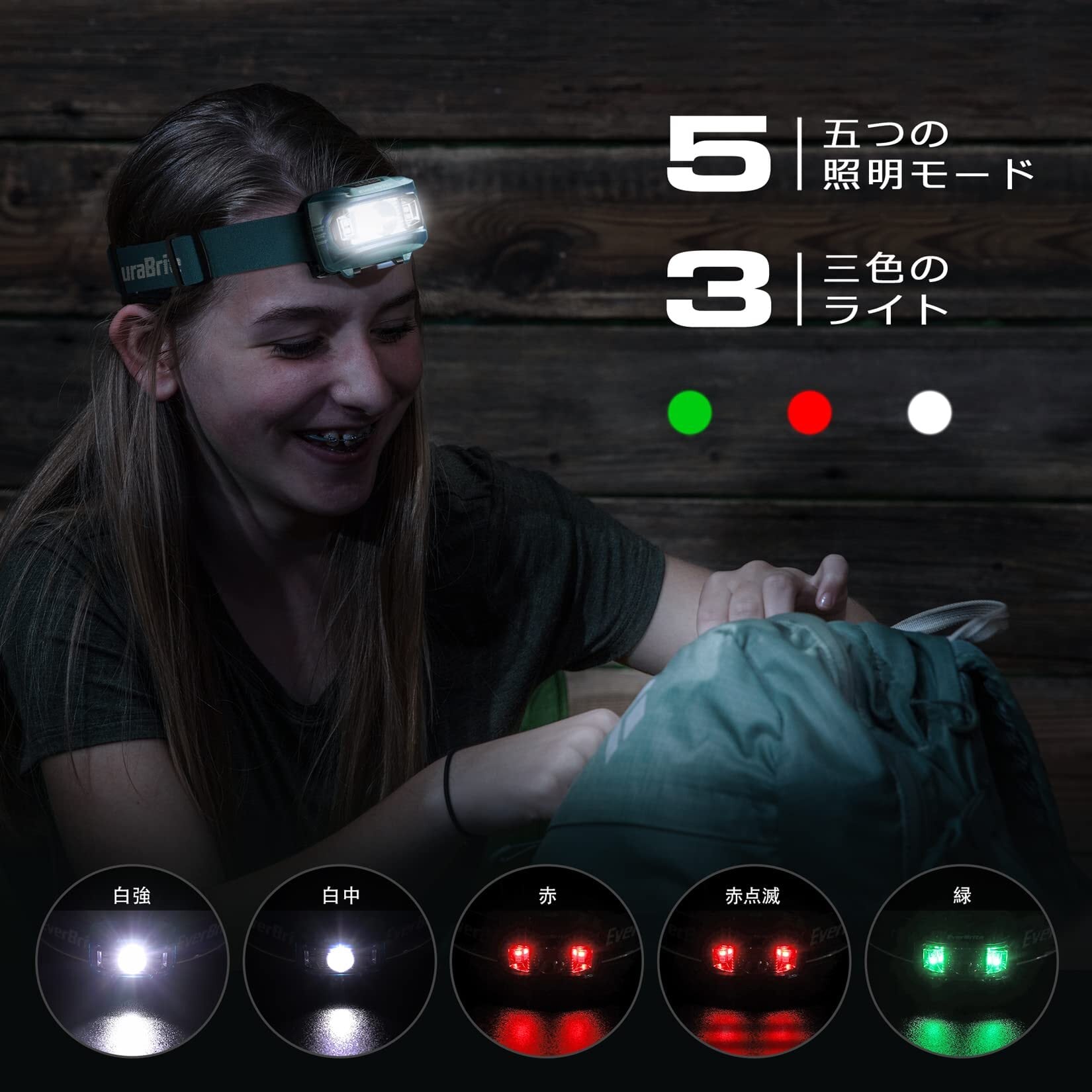 【5種の点灯モード・3色ラート】DuraBriteヘッドランプは5種の点灯モードを配置しています。スイッチボタンを短押すと、メインライト強-メインライト中-赤ライト-赤点滅-緑ライト-電源offを切り替えます。メインライトはアウトドア活動、仕事、災害時、最大の明るさと最も長い点灯時間を与えます。赤と緑ライトは魚、エビ、その他の動物に驚かされることはなく、夜間釣り、捕獲、動物撮影に適しています。