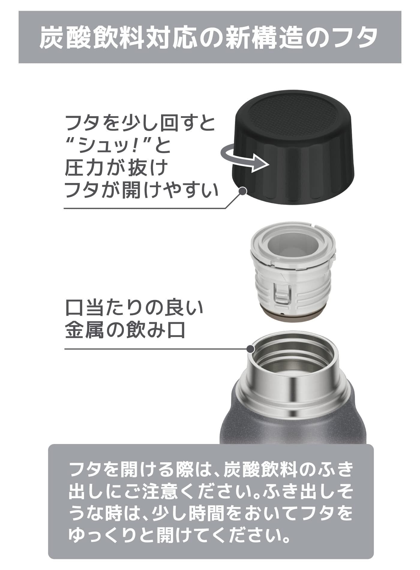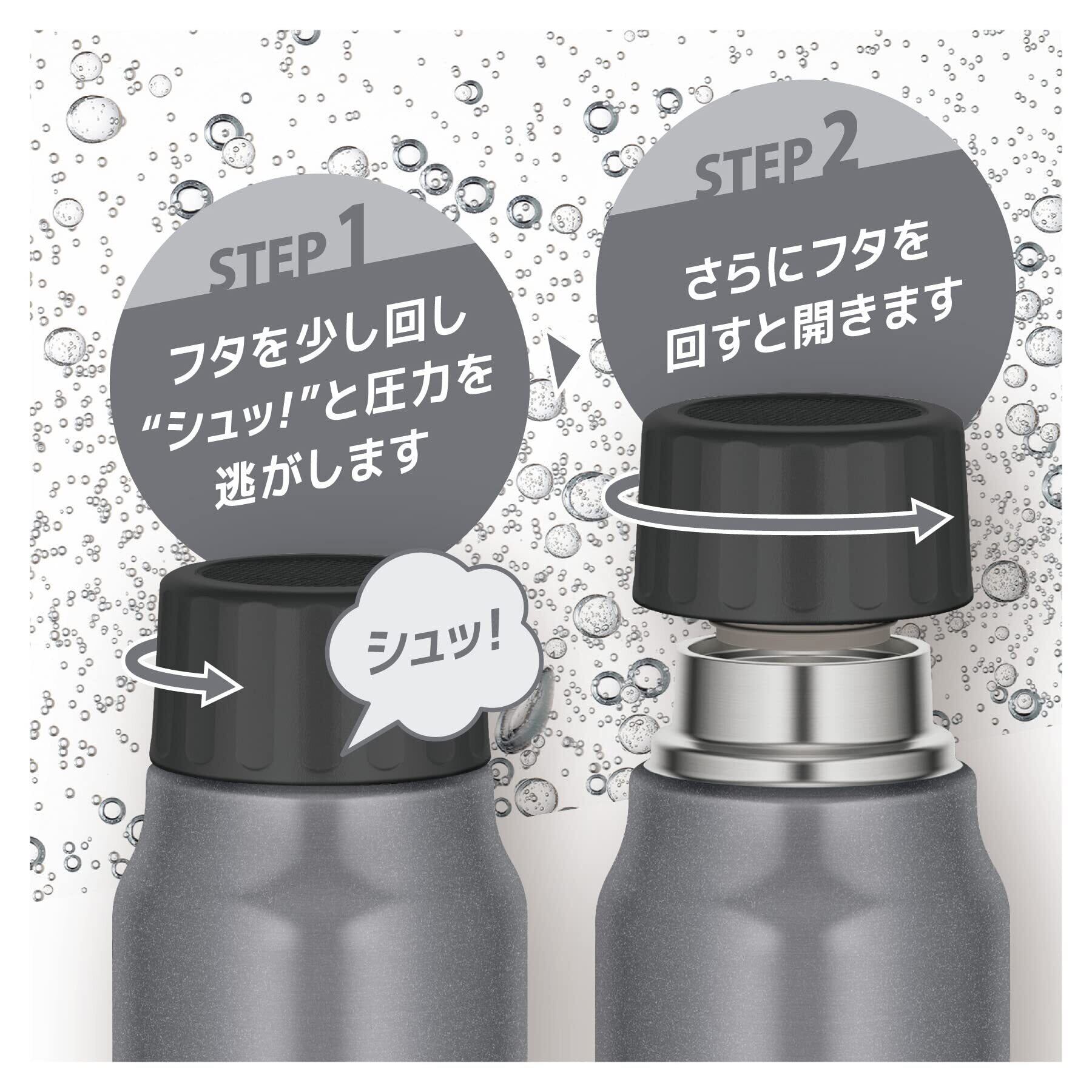 炭酸飲料に対応したスクリュータイプのボトル。フタを少し回すと、"シュッ"と圧力が抜けフタが開けやすい。