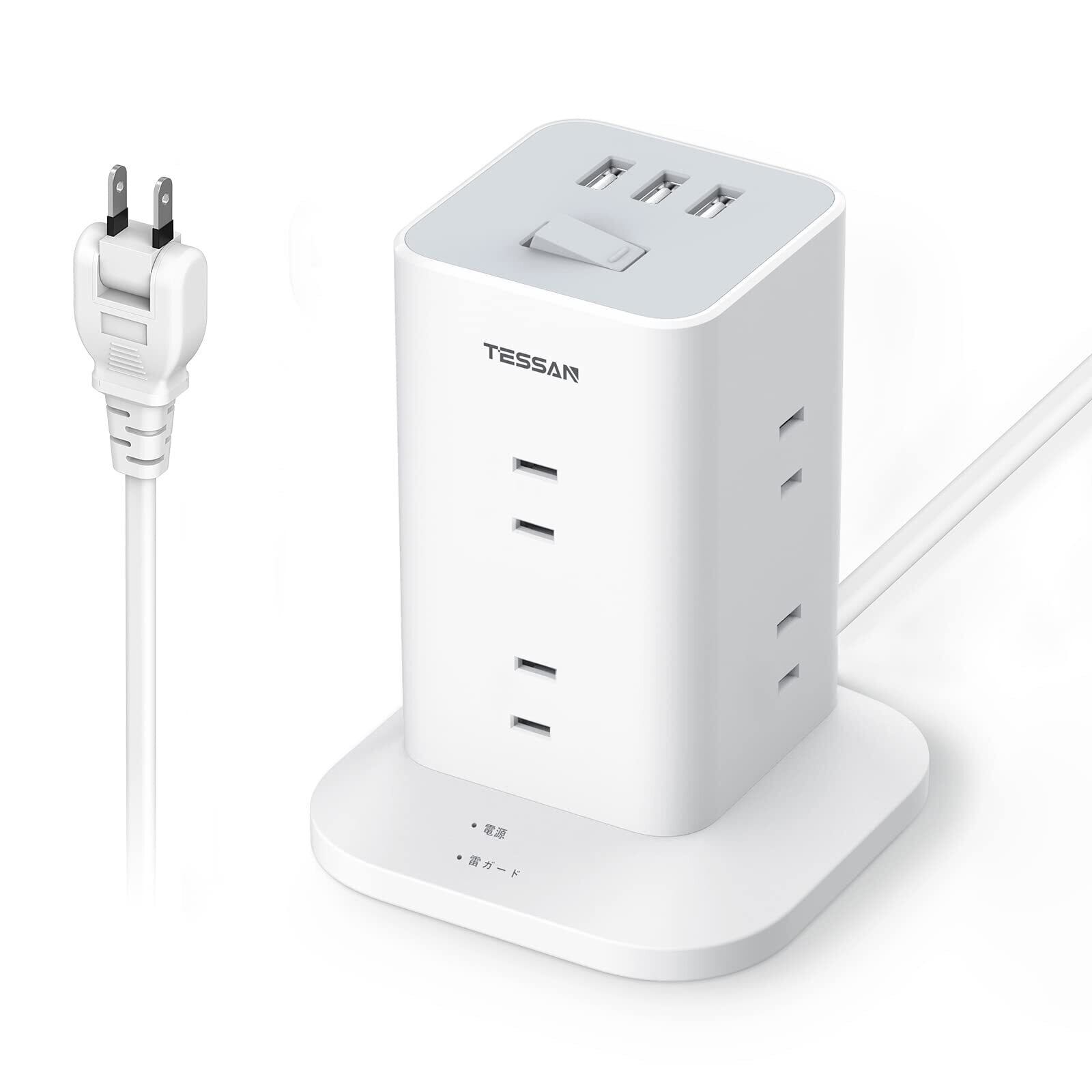電源タップ タワー mini型 2m 延長コード 8個AC コンセント 3USBポート付き 180°スイングプラグ TESSAN テーブルタップ 蛸足コンセント タコ足配線 マルチタップ OAタップ 雷ガード 一括スイッチ 省エネ