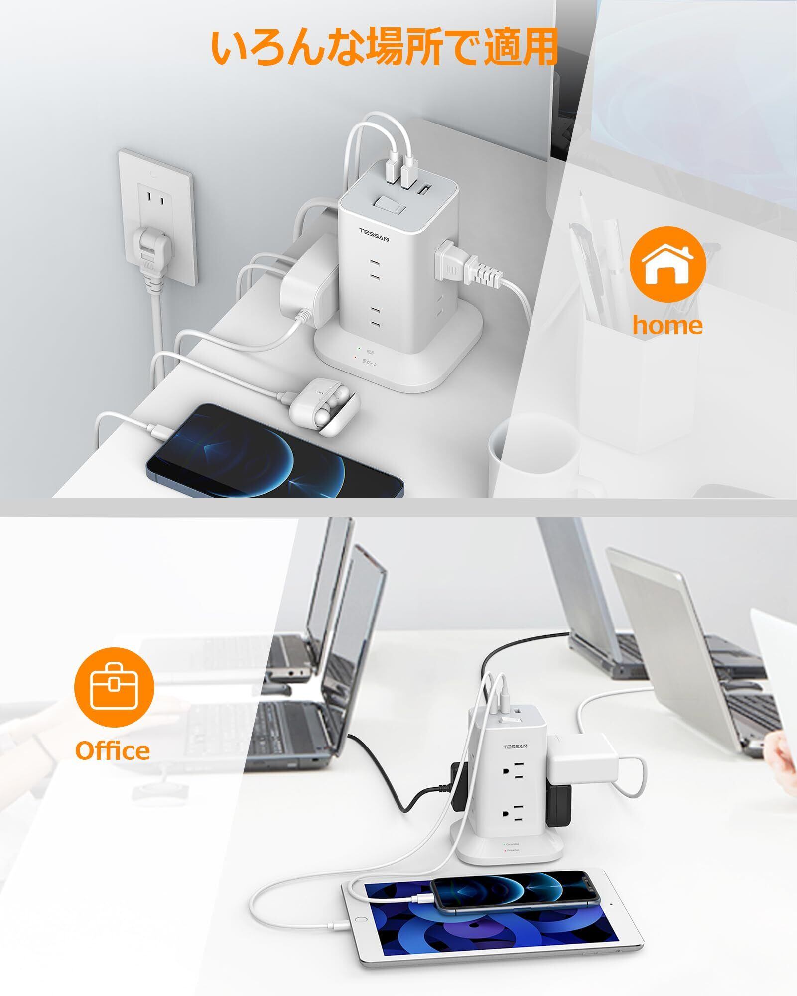 【タワー電源タップmini型】この電源タップは日本のために研究し、設計されていて、一般的なタワー型コンセントより小型でコンパクトです(本体サイズ:僅か10x10x12.7cm)。在宅勤務、オフィス、会議室、学校、寮、パーティーなど様々な使用場所で活用できます。
