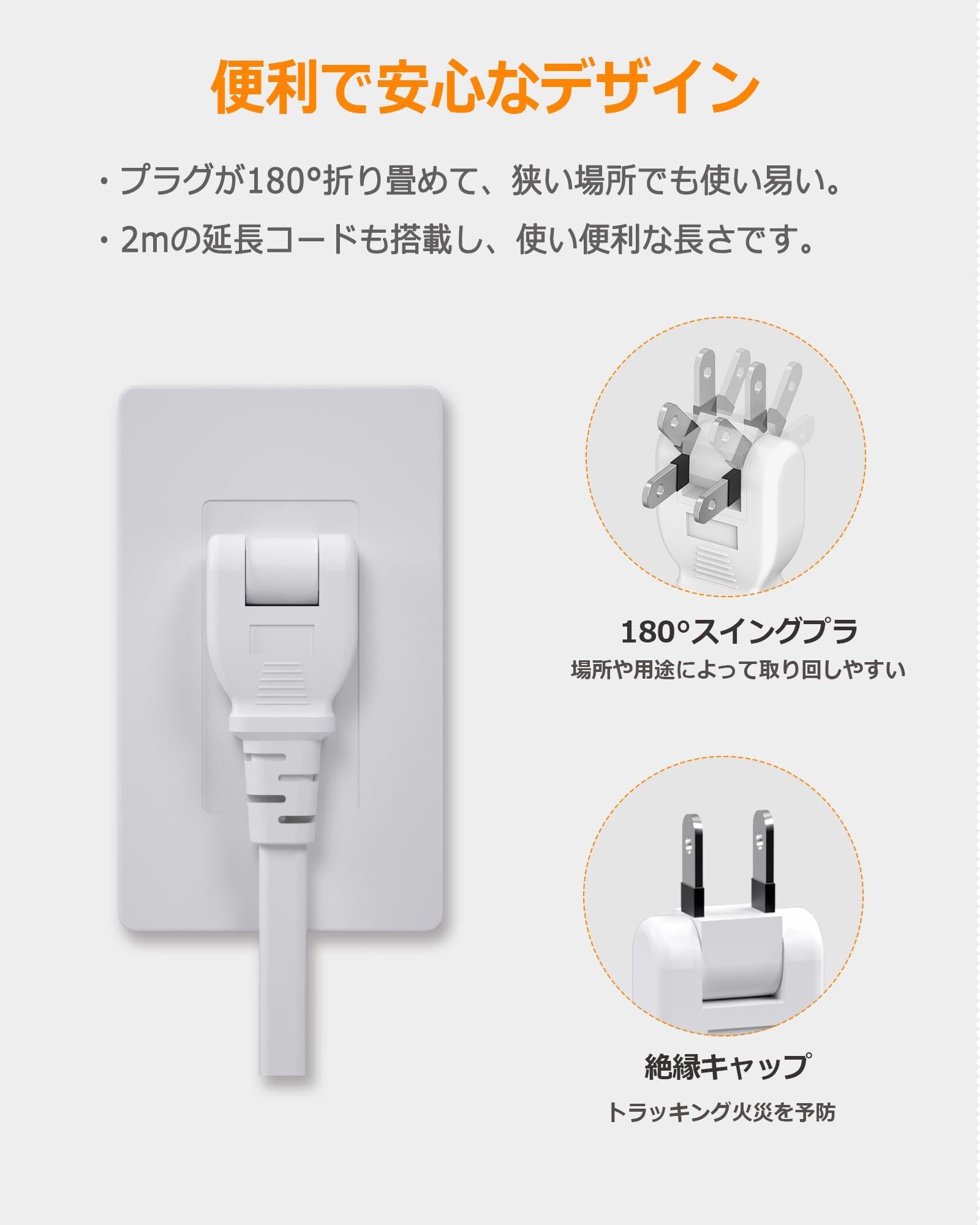 【使用者の便利に配慮】このタップは狭い場所でも配線しやすい180°スイングプラグを採用しています。 それに、プラグの刃の根本に絶縁キャップが付いており、万一の発熱の際にも融解しにくく、電気火災の防止に有効です。2メートルの延長コードも付いており、コンセントから少し距離を離れても配線しやすいです。