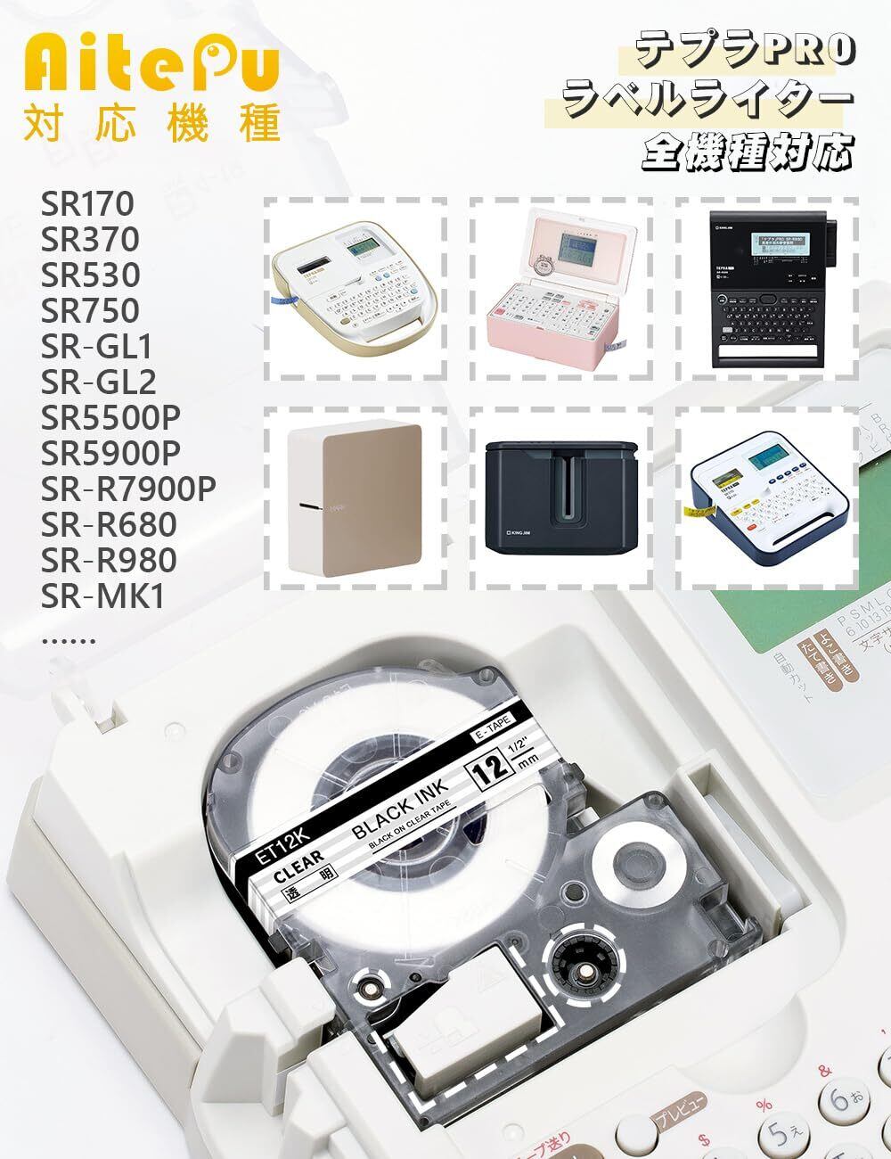 【ラベルライター対応機種】: SR-MK1、SR-R7900P、SR-R980、SR-R680、SR370、SR170、SR150、SR-GL1、SR-GL2、SR970、SR950、SR750、SR670、SR550、SR330、SR5900P、SR5500P、SR3900P、SR3500P、SR250、SR45、SR-RK2、SR720、SR600、SR530、SR3700P、SR52、SR300、SR300RK、SR300TF、SR40、SR-RK1、SR818、SR828、SR900、SR910、SR920、SR930、SR606、SR707、SR515、SR717、SR616、SR626、SR636、SR737、SR535、SR710、SR510、SR610X、SR520、SR404、SR313、SR323、SR333、SR50、SR51、SR30、SR210、SR220、SR130、SR-PDP1、SR-PBW及びその他テプラproラベルライター。