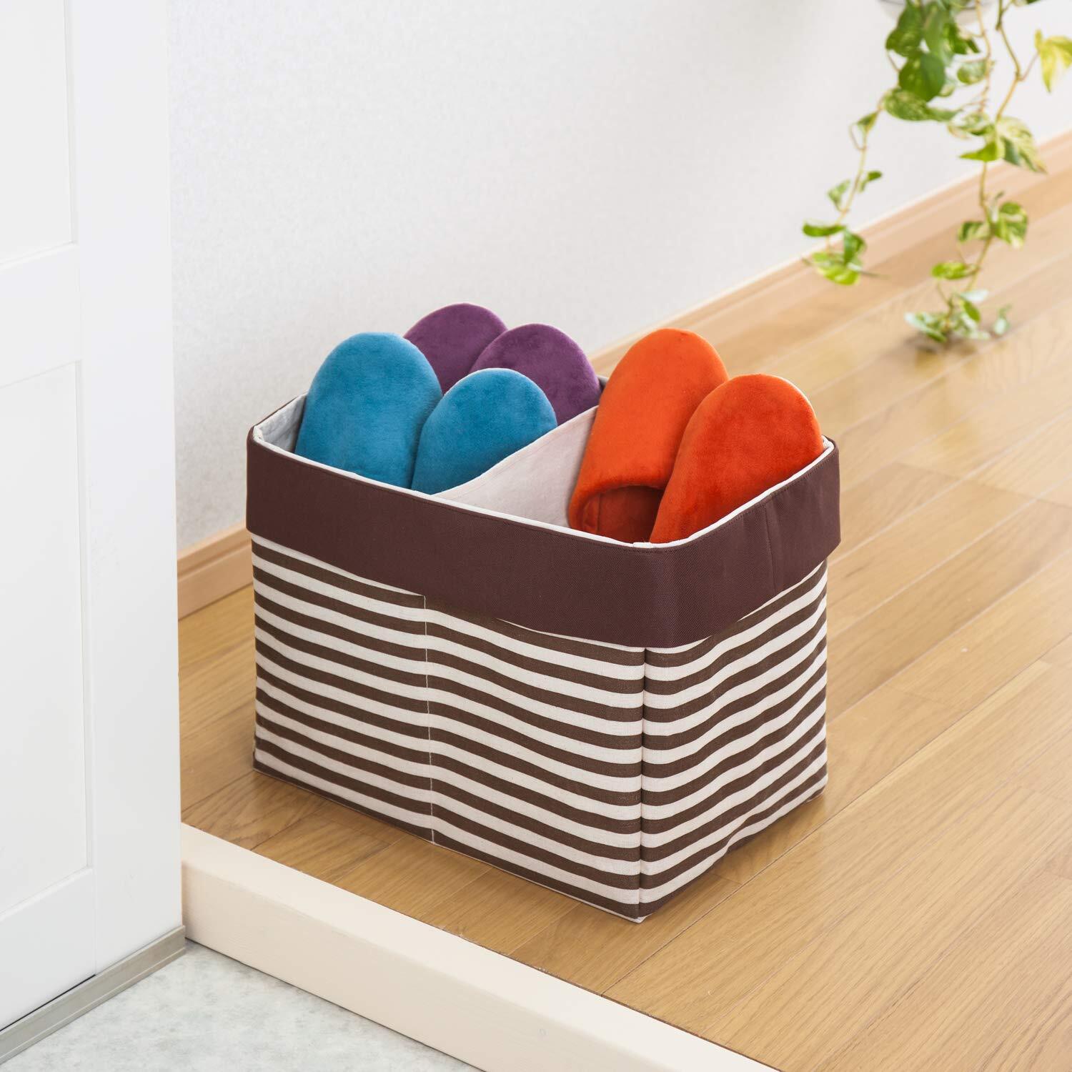 【商品仕様】:サイズ/約幅35×奥行23×高さ27㎝、カラー/ブラウン×ホワイト、柄/ボーダー柄、内容/1個、収納目安/スリッパ約8~10足、材質/麻(ポリエチレンコーティング)・ポリエステル