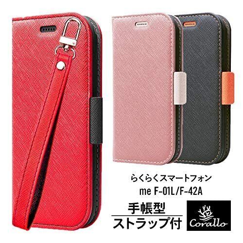 【Corallo】 らくらくスマートフォン me F-01L / F-42A 対応 ケース 手帳型 ストラップ 付き マグネット 式 ベルト スタンド 機能 薄型 手帳 レザー カバー カード 収納 付 [ らくらくスマホ らくらくホン me 対応 ] NU レッド×ブラック