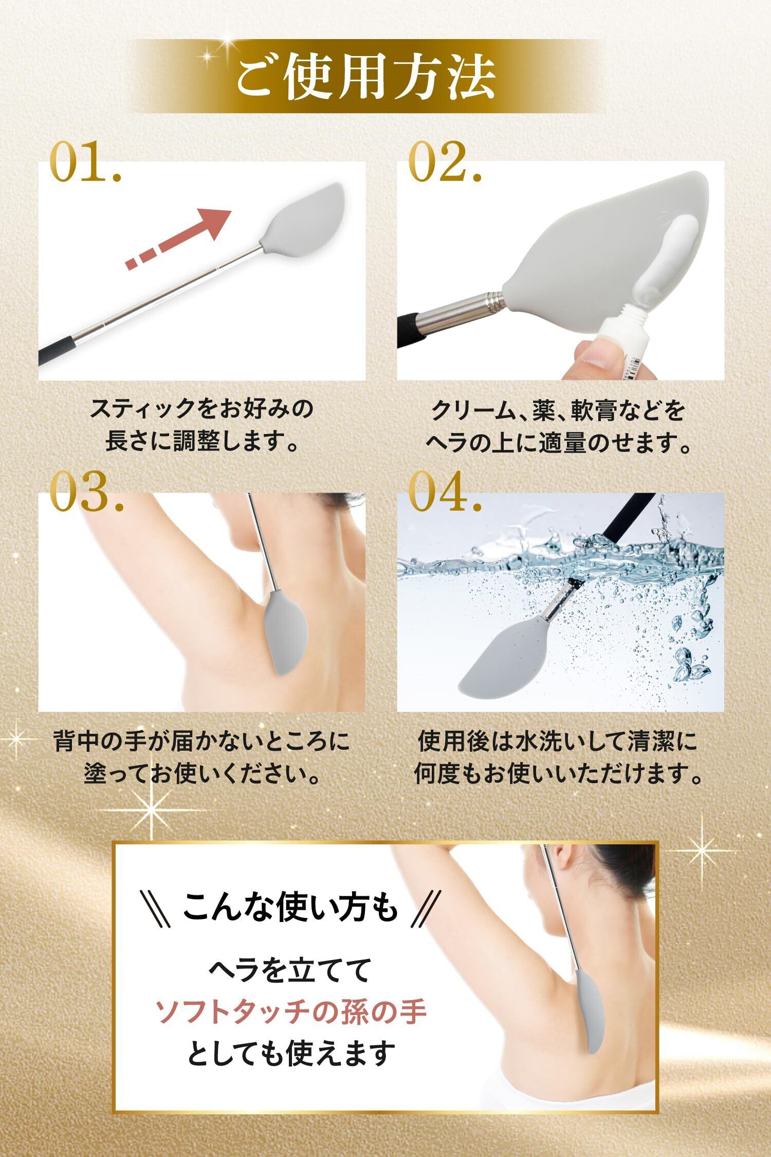 23cm~69cmの範囲で伸縮可能。体のサイズに合わせたお好みの長さに伸ばしてお使いいただけます。背中や腰など難しい箇所でもスムーズにローションを塗ることができます。