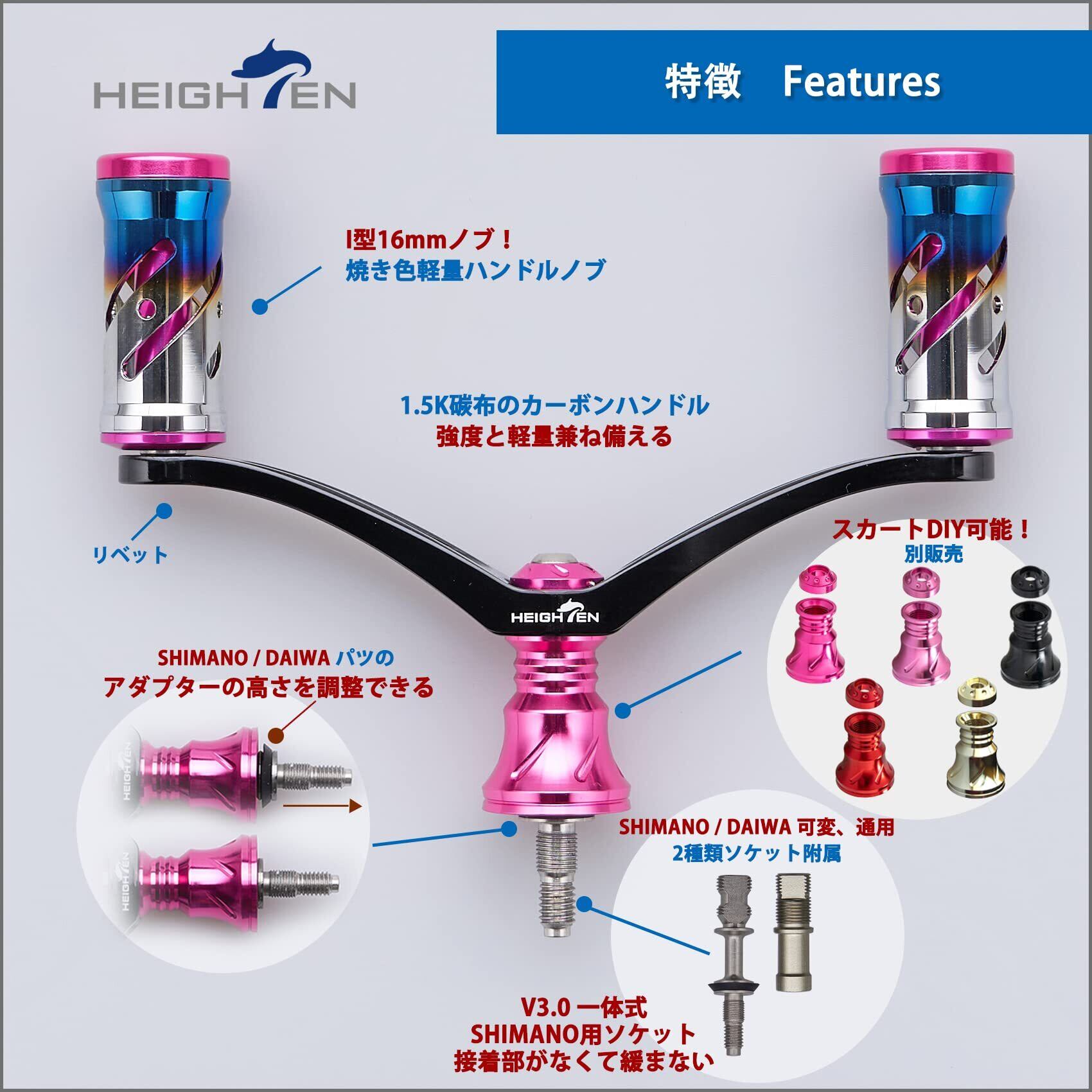 HEIGHTEN 92mm リール ハンドル 16mm ノブ 搭載 シマノ ダイワ 通用 スピニングリール用 Vortex Series