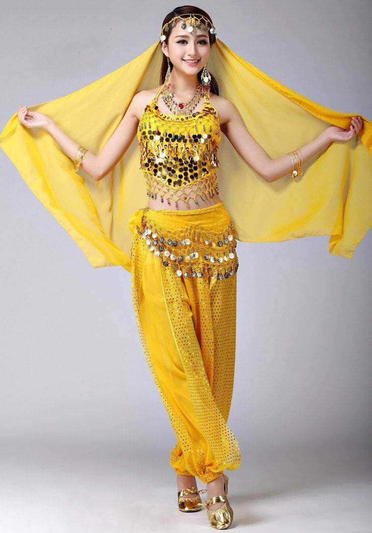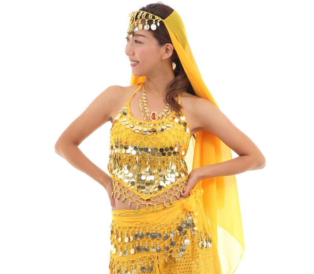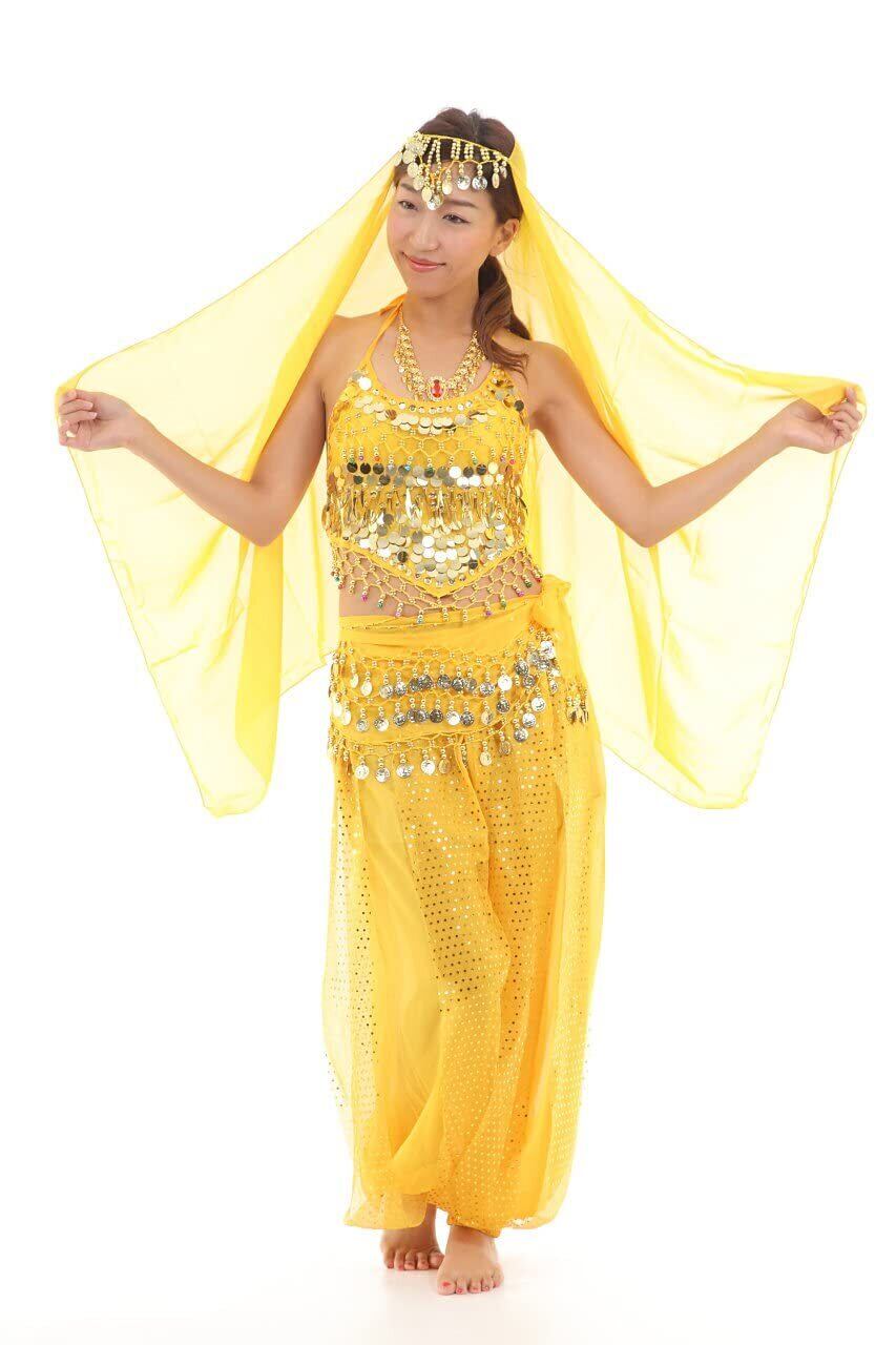 【セット内容】トップス(カップ入り、胸の後ろで紐で結ぶタイプ。首はホルターネック) + パンツ + ベール + ネックレス + ブレスレット2個 + ウエストチェ—ン (セット内容以外の小物は含まれません。) 【生地】ポリエステル